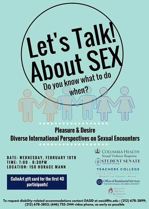 Please join the Sexuality, Women, and Gender Project, TC Student Senate, TC Diversity and Community Affairs, and Sexual Violence Response at Columbia Health, in a discussion about healthy communications about orgasm, pleasure, and desire with diverse and international perspectives on sexual encounters. This discussion will be led by facilitators from SVR at Columbia University and will focus on giving tips for positive communication to increase consensual and pleasurable sexual encounters.